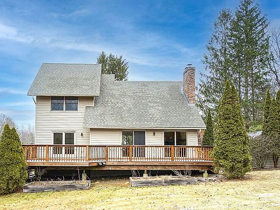 Set on 1.9 acres with stone walls and perennials, this home features an open-concept layout with vaulted ceilings, brick hearth, and hardwood floors. A maple kitchen with granite counters and pantry flows to the dining area. Dual sliders lead to a deck. Conveniently close to highways. Furnishings not included.