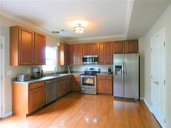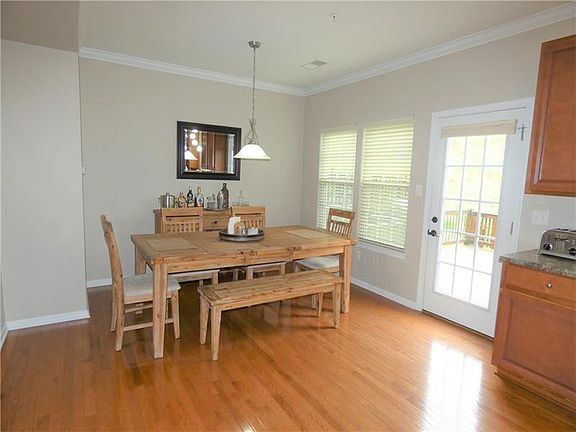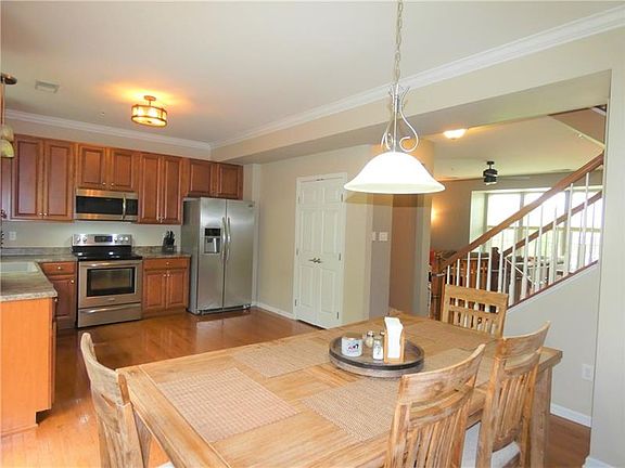 Pristine, modern and trendy describes this well appointed townhouse with brick front, large bay window and gabled roof line. It offers approximately 1825 square feet of finished interior living area plus a gated private 16x16 rear deck for hours of outdoor enjoyment. Features include 9' ceilings, gleaming hardwood flooring, an open concept main living area with enough open area to add a future kitchen island should you desire, a tastefully finished walk out lower level, kitchen updated w/Frigidaire Gallery SS appliances/new sink/fixtures. Upper level laundry room includes Samsung washer and dryer, equipped for surround sound speaker and security systems, french door to freshly stained, gated deck with custom built privacy screen, rear view is of open green space, ease in travel, and close proximity to ample shopping, dining, schools, worship, recreation. This home offers a one year home warranty protection plan. The monthly HOA fee covers all lawn maintenance and grounds maintenance.