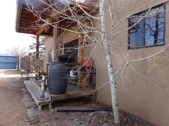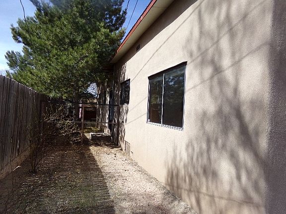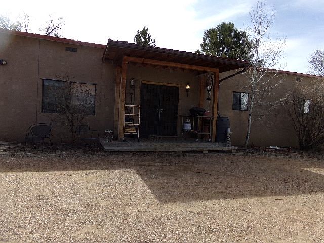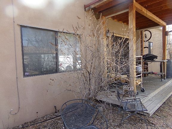 15 year old adobe on gated .23 acre lot, totally fenced with tall privacy fencing. Nice sitting front porch with mature landscaping, includes 4 Pine trees, 2 Aspen, flower beds, sitting bench as well as room for veggie garden, chicken coop conveniently tucked away on West corner of backyard. Nice combo cooking/eating kitchen, formal dining room in sunroom area. Recent remodel includes metal rack over counter to keep all your pots and pans hanging out of the way. Every thing works. 3 bedrooms with 2 full baths with carpet and hardwood floors, Clay and Diamond finish interior walls, maintained exterior stucco, all this under a metal pro-panel roof. All appliances stay. Extra large metal shop, 3 bays. Complete your shop by negotiating for: shelving, work benches welding equipment, including air compressor and auto lift inside shop.