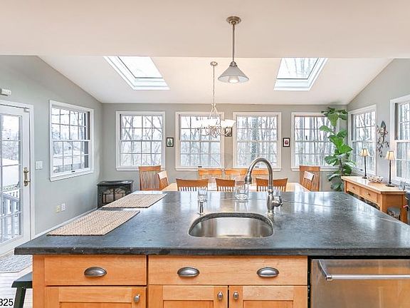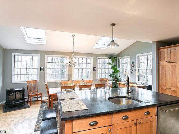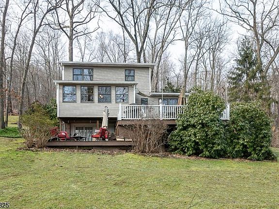 Charming & Private home on a 1 acre wooded lot w/a park like setting, backs to the Morris Canal. Stunning mountain views that can be enjoyed from the multi-level deck or the wall of windows in the dining room & kitchen. Gorgeous kitchen with large center island, SS appliances, custom concrete counter tops, loads of storage. A pellet stove in the dining room offers a cozy feel. Main floor living room with wood burning fireplace. 1st floor den/office & powder room. Entire 1st floor is hardwood flooring. Full walk-out basement with brand new carpet. Home has a main driveway with parking for 4 cars & a road level parking area that fits 4 cars. Generator plug installed/ Honda generator is included. Newer windows in most of home. Septic has been inspected, d-box repair being completed. Close to schools!