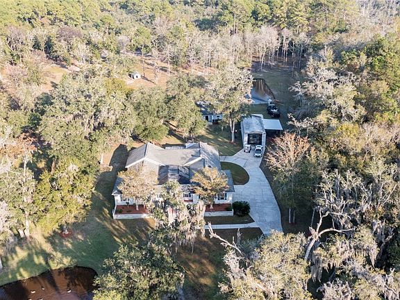 Country living & city close - Wonderful homestead location on 3.8 Acres with a pond, manicured lawn & draping oaks. 3BR/2BA, 2370 SQFT oyster shell stucco - 2x6 construction located on cul-de-sac. Front door opens to an unexpected, huge, totally-screened open air living space (892 SQFT!). This large central space opens up the ENTIRE house via five sliding doors. Leave the doors open at night and enjoy the breezes and the hoot owls as you sleep! Home features include architectural shingle roof, vaulted ceilings, new flooring & new granite in kitchen & primary bath. You really must view this home to appreciate its unique style and comfort. Spacious family room, dining area & kitchen with large island, refrigerator, dishwasher & stove. Split bedroom plan. Primary suite includes bedroom & bath with double vanities & tile shower. Flex room perfect for office or den. Back screened porch & attached shed with power. Fenced 2 acres with separate gated enclosures & a 12' x 12' multipurpose animal building. Horse lovers dream! Also features 2 car, side entry garage & 2 car carport. 28' x 32' workshop is insulated, heated & cooled, has power & water & could be converted to guest suite. 18' x 40' RV enclosure with electric. Raised garden beds with auto water system. Extra-large laundry room with washer & dryer. Only minutes to kings bay naval base, schools & shopping. Less than 1 mile to I-95 exit 6. City water, city sewer & shallow well. No city taxes required. Old republic ultimate protection home warranty provided!