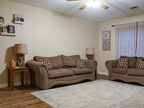 Recently Updated 3 bed, 2 bath 2 car garage charming home in Fort Gibson Schools centrally located in town on quiet Cul-De-Sac. Full brick home w/ guttering! This home boasts Low maintenance Tile wood flooring, luxury vinyl tile, Walk in closet in main bedroom and a convenient split floor plan! Enjoy the spacious outdoor deck and full privacy fenced backyard along w/ two bonus buildings w/ electric! This home qualifies for the USDA No $ Down loan. Located minutes from Fort Gibson Lake