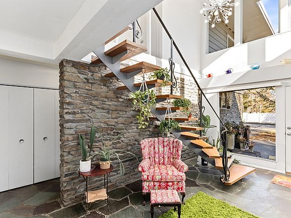 This Mid Century Modern 2-bedroom, 1.5-bath contemporary home is situated in a great neighborhood lined with flowering cherry trees, offering convenient access to commuter rail and highways, as well as nearby shopping and dining options. The home features stunning vaulted ceilings and a unique curved staircase that adds character and elegance. The impeccably landscaped yard is perfect for outdoor enjoyment, with well water available for efficient irrigation. A perfect blend of style, functionality, and location! Solar will transfer to new owner.