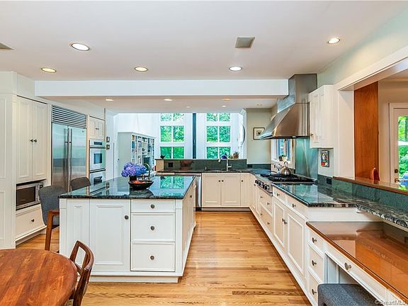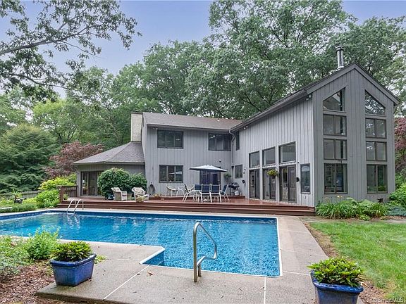 Serene elegance describes this 3.2 acre mini-estate in Robinson Woods. The winding drive leads through the beautifully landscaped property to the home which is set well back from the street. The contemporary home has gracious lines and an inviting appeal. The foyer sets the tone: wide spaces, distinctive architecture and great use of materials. The living room with vaulted ceiling, a broad sweep of windows and fireplace - super for intimate gatherings or large parties. A broad hall, with wet bar closet, leads to the Dining Room, Study, and then to the remodeled Kitchen. The 6-burner Viking stove, the large island, 2 sinks, granite counter and pantry contribute to the appeal of this kitchen which opens to the large Family Room which is 2 stories high, has custom windows, wood stove, and to the decks and inground pool. The laundry room is between the kitchen and the garage and there is a mud room which connects to the garage with a full bath and is very convenient from the yard or pool. Also on the first floor is a large bedroom and a renovated full bath. On the 2nd floor is the Master Suite with multiple closets, skylights and an enormous, renovated master bath with soaking tub and separate glassed shower. There are also 2 additions bedrooms and a renovated hall bath. Close to the town center and transportation, the sense of leaving the world behind when you come to this property is enveloping. Locate in a private association this property is a rare find.