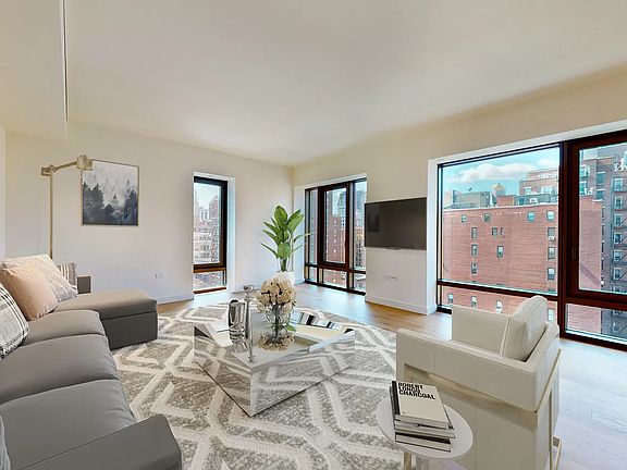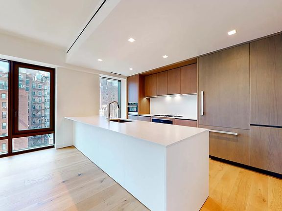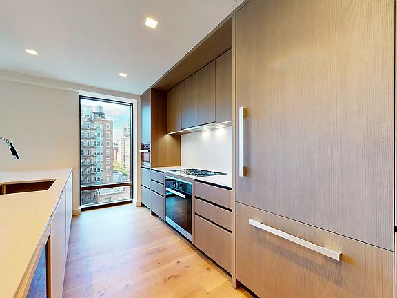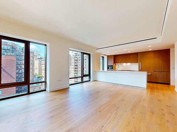 Residence at 200 East 21st Street is a stunning 1,429 square foot 2-bedroom, 2-bath home with striking views and beautiful light streaming in from Southern, Western, and Eastern exposures. Thoughtfully proportioned rooms and spaces feature oversized bronze windows and 7 inch wide plank oak flooring finished in a smoked oil stain, while grand entry and interior doors feature Valli & Valli hardware throughout. The oversized Poliform kitchen features a white matte lacquer peninsula and custom oak cabinetry finished in a smoked oil stain, complemented by white sand Quartzite countertops and backsplash. The kitchen is outfitted with a fully integrated luxury appliance package by Miele. Each of the two bathrooms features radiant heat flooring and sensuous materiality. The lavish master bath is encased with Turkish Lilac marble walls, custom RiFRA vanities, and Dornbracht fittings and fixtures throughout.