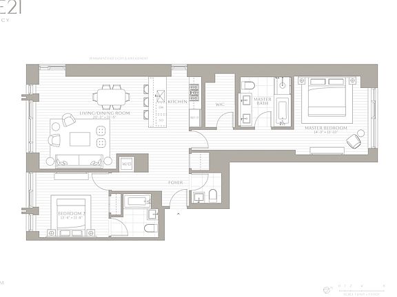 Residence 11D at 200 East 21st Street is a stunning 1,464 square foot 2-bedroom, 2.5-bath sun-drenched corner home with striking views and beautiful light streaming in from three exposures north, south, and east, in the heart of Gramercy. Thoughtfully proportioned rooms and spaces feature over 8' tall bronze windows and 7" wide plank oak flooring finished in a sophisticated custom smoked oil stain, while grand entry and interior doors feature Valli & Valli hardware throughout. The large Poliform kitchen designed by Champalimaud features a white matte lacquer breakfast bar and custom oak cabinetry finished in a smoked oil stain, complemented by white sand Quartzite countertops and sleek Dornbracht fixtures. The kitchen is outfitted with a fully integrated luxury appliance package by Miele. Each of the two bedrooms features an en-suite bath with radiant heat flooring (only in the master bathroom) and sensuous materiality. The lavish master bath is encased with Turkish Lilac marble walls, custom RiFRA vanities, and Dornbracht fittings and fixtures throughout. The secondary bathroom features polished white stone floors and a custom RiFRA vanity with Dornbracht fittings and fixtures. The powder room is richly appointed with Nero Marquina and white stone flooring, and custom RiFRA vanity. A Miele Prestige Washer and Dryer, state-of-the-art Daikin heating and cooling system, and pre-wiring for motorized shades at all windows complete this outstanding residence. 200 East 21st Street is a private enclave of 67 exceptional residences situated in the highly sought-after Gramercy neighborhood. The renowned architects at BKSK have brought a sophisticated depth and artistry to the historically contextual masonry and glass facade that is both quiet and commanding. The sumptuous interiors are crafted by the celebrated design firm, Champalimaud, while renowned landscape architect Halsted Welles Associates has designed thoughtfully integrated communal green spaces and landscaped private terraces. Opportunities for wellness abound, as carefully conceived indoor and outdoor spaces create a holistically enriched living experience, including a sky-lit formal Wellness Suite reception area; sun-filled fitness center with adjacent lockers, sauna, and treatment room; residents' lounge with entertainment center and entertaining kitchen; and integrated planted rooftop lounge designed by Halsted Welles Associates featuring lush and native adaptive plantings and meandering stone pathways for a peaceful retreat from the excitement of the city. 200 East 21st Street offers a suite of sustainable features targeting LEED Gold Certification, including solar-heated domestic water; advanced-performance windows and reinforced insulation for reduced energy consumption; rainwater collection for irrigation of the planted gardens; high-efficiency appliances; and responsibly sourced eco-friendly materials and finishes.