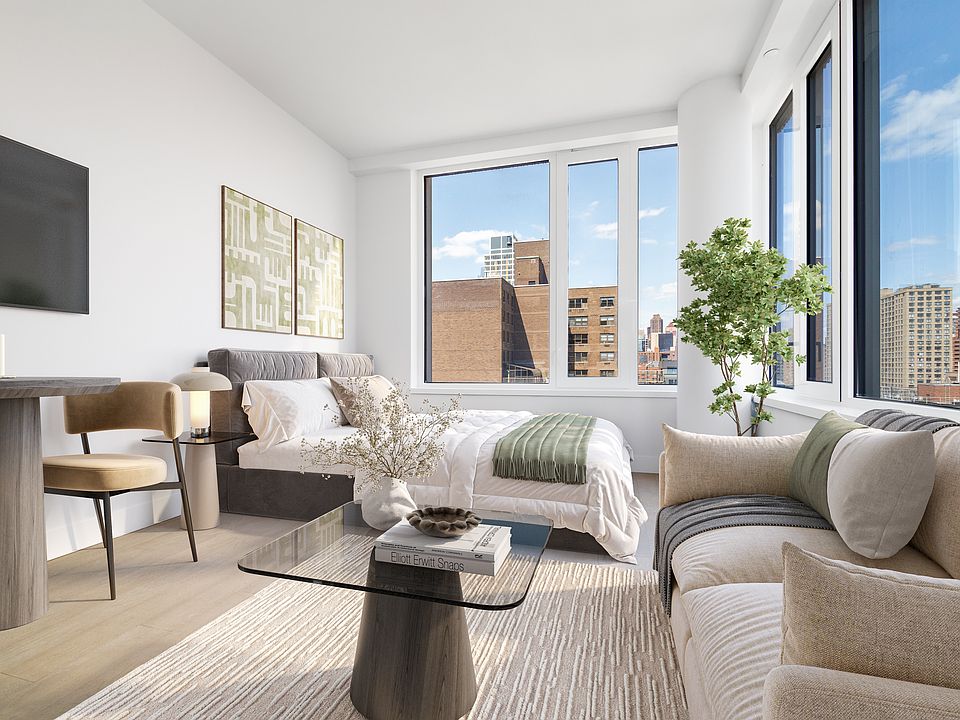 Bright and sunny Studio apartment in luxury new development with double exposure! Boasting 10.5' ft ceilings and wide plank wooden flooring, 9F offers open double exposure (North and East), airy layouts, and the highest quality fixtures and finishes throughout. 9F includes a ventless Bosch washer/dryer conveniently tucked away in a closeted area. Thoughtfully designed kitchens provide a clean, modern layout with integrated cabinetry, best- in-class appliances, custom millwork, and Calacatta quartz countertops with full-height backsplashes. An induction cooktop, Blomberg dishwasher, Blomberg refrigerator, and stainless steel under-mount sink from Kohler with Brizo fixtures complement a stainless steel Bertazzoni convection oven and hood. A true retreat, Gemma's serene baths make every day feel as though you've stepped into a luxurious hotel. Outfitted in white tile from Porcelanosa, features include quartz vanities from Kohler with Duravit fixtures and Kohler toilets. Hydro designs the soaking bathtubs. The system features both regular and handheld pressure balance shower heads from Brizo. Gemma offers an elevated lifestyle and luxurious retreat with its dedicated fitness center, comfortable second-floor lounge, bicycle storage space, rooftop entertaining lounge, and a stunning rooftop terrace with panoramic city skyline views. Adding to its many desirable features, Gemma is a Passive House residence, reducing energy consumption by up to 85% while delivering the highest standard of green living, superior comfort, and indoor air quality. *Photos are representative of finishes and design, not the actual unit.