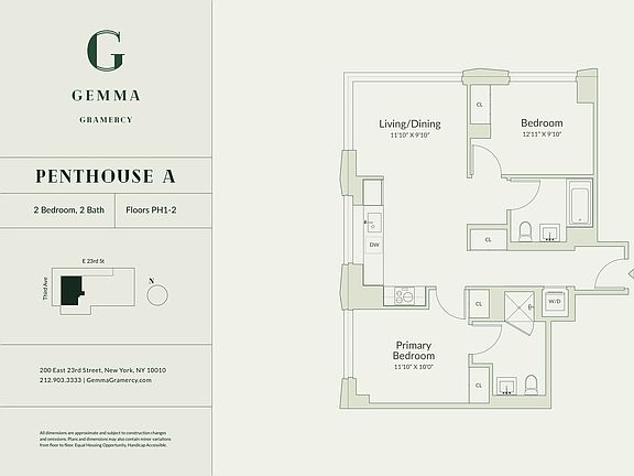 Tenant Occupied - Available Starting 6/1. Showing by appointment only. Please inquire via Streeteasy to set up an appointment. All requests will be responded to via email. Welcome to The Gemma! Beautiful 2 bedroom 2 bath penthouse unit in Gramercy Park with double exposure. Boasting 10.5 ft ceilings and wide plank wooden flooring, PH2A offers open, airy layouts and the highest quality fixtures and finishes throughout. PH2A includes ventless Bosch washer/dryers conveniently tucked away in a closeted area. Thoughtfully designed kitchens provide a clean, modern layout with integrated cabinetry, best-in-class appliances, custom millwork, and Calacatta quartz countertops with full-height backsplashes. A stainless steel Bertazzoni convection oven and hood are complemented by an Induction cooktop, Blomberg dishwasher, Blomberg refrigerator, and stainless steel under mount sink from Kohler with Brizo fixtures. A true retreat, Gemma's serene baths make every day feel as though you've stepped into a luxurious hotel. Outfitted in white tile from Porcelanosa, features include quartz vanities from Kohler with Duravit fixtures and Kohler toilets. The soaking bathtubs are designed by Hydro System and feature both regular and handheld pressure balance shower heads from Brizo. Gemma offers an elevated lifestyle and luxurious retreat with its dedicated fitness center, comfortable second-floor lounge, bicycle storage, rooftop entertaining lounge, and a stunning rooftop terrace with grills and panoramic views of the city skyline! Adding to its many desirable features, Gemma is a Passive House residence, meaning it reduces energy consumption by up to 85% while delivering the highest standard of green living, superior comfort, and indoor air quality. *Photos are representative of finishes and design, not the actual unit.**
