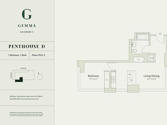 1 bed on the penthouse level with triple exposure and iconic Midtown views. Available for move in 4/1. Tenant occupied and requires advance notice to view. Message through STREETEASY to set up an appointment. Boasting 12 ft ceilings and wide plank wooden flooring, PH2D offers open, airy layouts and the highest quality fixtures and finishes throughout. Includes ventless Bosch washer/dryers conveniently tucked away in a closeted area. Thoughtfully designed kitchens provide a clean, modern layout with integrated cabinetry, best-in-class appliances, custom millwork, and Calcutta quartz countertops with full-height backsplashes. A stainless steel Bertazzoni convection oven and hood are complemented by an Induction cooktop, Blomberg dishwasher, Blomberg refrigerator, and stainless steel undermount sink from Kohler with Brizo fixtures. A true retreat, Gemma's serene baths make every day feel as though you've stepped into a luxurious hotel. Outfitted in white tile from Porcelanosa, features include quartz vanities from Kohler with Duravit fixtures and Kohler toilets. The soaking bathtubs are designed by Hydro System and feature both regular and handheld pressure balance shower heads from Brizo. Gemma offers an elevated lifestyle and luxurious retreat with its dedicated fitness center, comfortable second-floor lounge, bicycle storage, rooftop entertaining lounge, and a stunning rooftop terrace with panoramic views of the city skyline! Adding to its many desirable features, Gemma is a Passive House residence, meaning it reduces energy consumption by up to 85% while delivering the highest standard of green living, superior comfort, and indoor air quality.