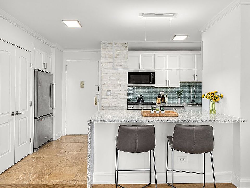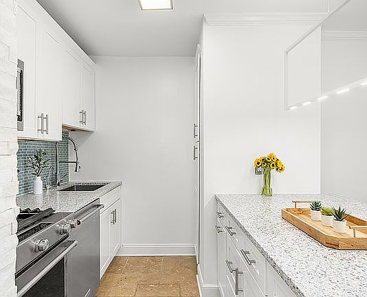 Calling all cooks! Come for the beautifully renovated kitchen and bring your toothbrush! Stay for the stellar bath renovation and the overall impeccable condition of this high floor, one bedroom in a full service Gramercy coop. The wide open kitchen with massive island and breakfast bar is a cook's dream. The built-in, full-sized refrigerator repositioned to the side not only expands the kitchen footprint but allows for multiple pull-out pantries, copious custom cabinets and drawers, and hidden garbage and recyclables. A top-of-the-line KitchenAid stainless appliance package, granite countertops, glass subway tile backsplash, garbage disposal, and instant, filtered hot and cold water offer clean design in a lovely, neutral palette. The south-facing living room has plenty of space for living and dining, including ample space to showcase your art. The stunning bath is designed with mini marble square and subway tiling juxtaposed with a classic marble basket-weave floor and a glorious glass-enclosed rain shower with multiple shower heads. The bedroom fits a queen bed with creative nooks for a desk or dressers. This one bedroom home is in pristine, fully-renovated condition, from the new wide plank oak floors and crown and base molding to the large custom closets and wiring for motorized shades. The Crystal House offers a central laundry, a bike room and a lovely roof deck. Storage is by wait list. The coop would consider co-purchasing, parents purchasing for working children, pets, pieds a terre and guarantors.