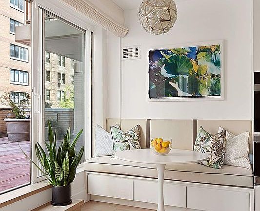 Enter into the sun-flooded living/dining space with soaring 9’ ceilings and direct access through three sliding glass doors into 1,600 square feet of private outdoor space. This enormous terrace, with northern and western views, is perfect for entertaining or creating the ultimate sanctuary. The kitchen features top-of-the-line appliances such as a Wolf induction range and oven, a Miele Combi- Steam oven, a Miele microwave, a Miele dishwasher, and a Bosch refrigerator. In addition, there is a Miele washing machine and dryer. Adjacent to the kitchen is an eat-in breakfast area. A powder room completes this portion of the home.