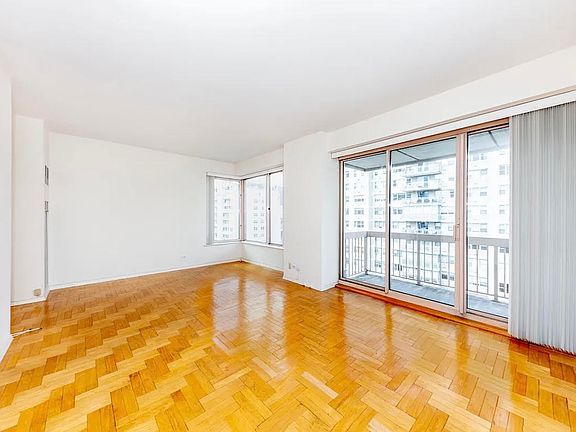 High floor, corner one bedroom with 1.5 baths, city views and private balcony, washer/dryer. This bright and sunny one bedroom apartment features a spacious living room with separate dinning area, floor to ceiling windows and double south and west exposures. Graciously proportioned, the master suite enjoys an oversize walk-in closet and spa-like bath with a double vanity. The seamlessly integrated, renovated chef's kitchen boasts sleek custom cabinetry, and top of the line appliances. A large balcony, city views from every room, and perfectly maintained hardwood floors throughout, complete this perfect residence. Exceptional service with full time 24 hour doorman & concierge, recently renovated gym, courtyard, and garage with direct access from the building. Conveniently located close to the 6, Q, and F trains, Central Park, Museum mile, and the best shopping and dining in the city.