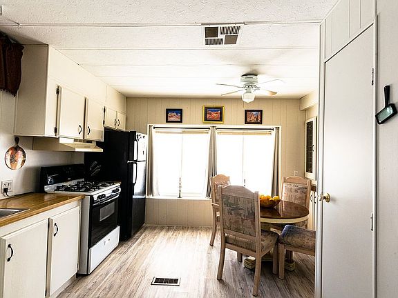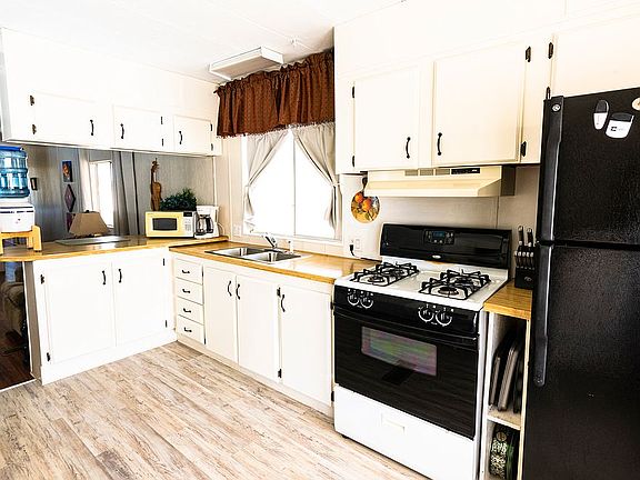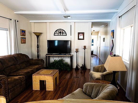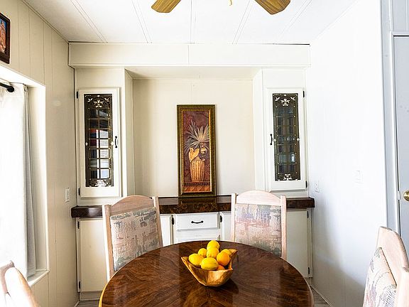 Furnished Mobile Home for Sale in 55+ community. Bright, open, cheery updated interior. 2 car carport, covered, fenced patio. Vinyl plank/laminate flooring throughout. Gas stove and water heater. Electric A/C and heat pump. Lot rent is $522/mo which includes water and garbage pickup.