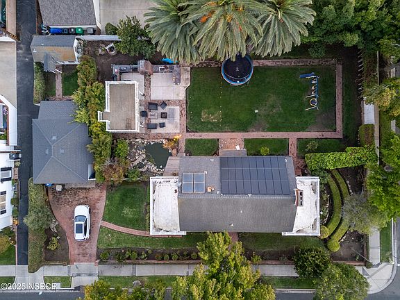 Welcome to the Carriage District--one of the most sought-after neighborhoods on the Central Coast. Built in 1925, this three-bedroom, three-bathroom residence spans 2,665 sq. ft. and blends timeless architecture with eclectic design.Inside, you'll find hardwood floors, crown molding, French doors, elegant lighting, and a stunning staircase railing. Expansive windows flood the home with natural light, highlighting the meticulous attention to detail throughout. The upstairs bathroom preserves vintage charm with its original floating bathtub and Midlon Hall hardware. The chef's kitchen offers custom cabinetry, a country sink, and a professional-grade Italian stove with double ovens and six burners.The curb appeal is undeniable--white exterior with black shutters, classic brickwork, and two balconies. The property also includes a detached garage, brick-lined driveways, ivy-covered brick fencing, and lush landscaping that frames the home beautifully.In the backyard, discover a private retreat featuring a detached guest quarters with one bedroom and one bathroom, a koi pond, a pergola, and a full outdoor kitchen complete with pizza oven, oak pit barbecue, and gas grill--ideal for entertaining or relaxing in privacy. And for added efficiency, this home comes with owned solar.This is truly a home you'll fall in love with the moment you pass through the gates.