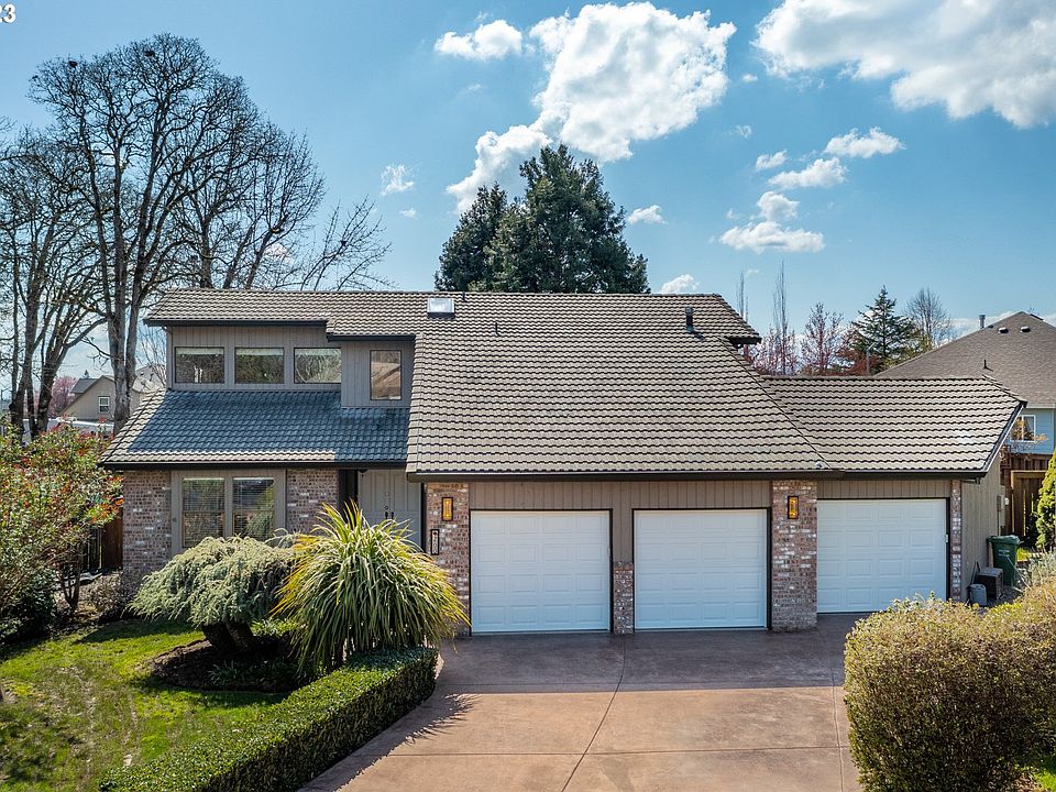 Charming Contemporary home in desirable North Newberg Location with 3 car garage. Stamped concrete driveway and entry walk way lead to covered front entry with double doors - enter to main level with hard wood floors through entry, living kitchen and dining areas. Floor to ceiling windows flood the living space with natural light- cellular shades on windows for privacy. Large kitchen with plenty of storage and stainless appliances including NEW gas range, newer 2 drawer- french door refrigerator. Kitchen adjoins informal eating area with large picture window to fenced back yard. Two main level bedrooms both with walk in closets, one with attached bathroom. Main bedroom on upper level has plenty of storage and large bathroom with hardwood and skylight. Fenced back yard with covered deck/patio area (wired for hot tub), mature landscape, gate to park behind home. 3 garage bays- exceptionally clean, storage racking will remain, all bays have newer openers and insulated doors, third bay/workshop has 220v power. Near parks & Schools- easy commute to Hillsboro, Beaverton ect.