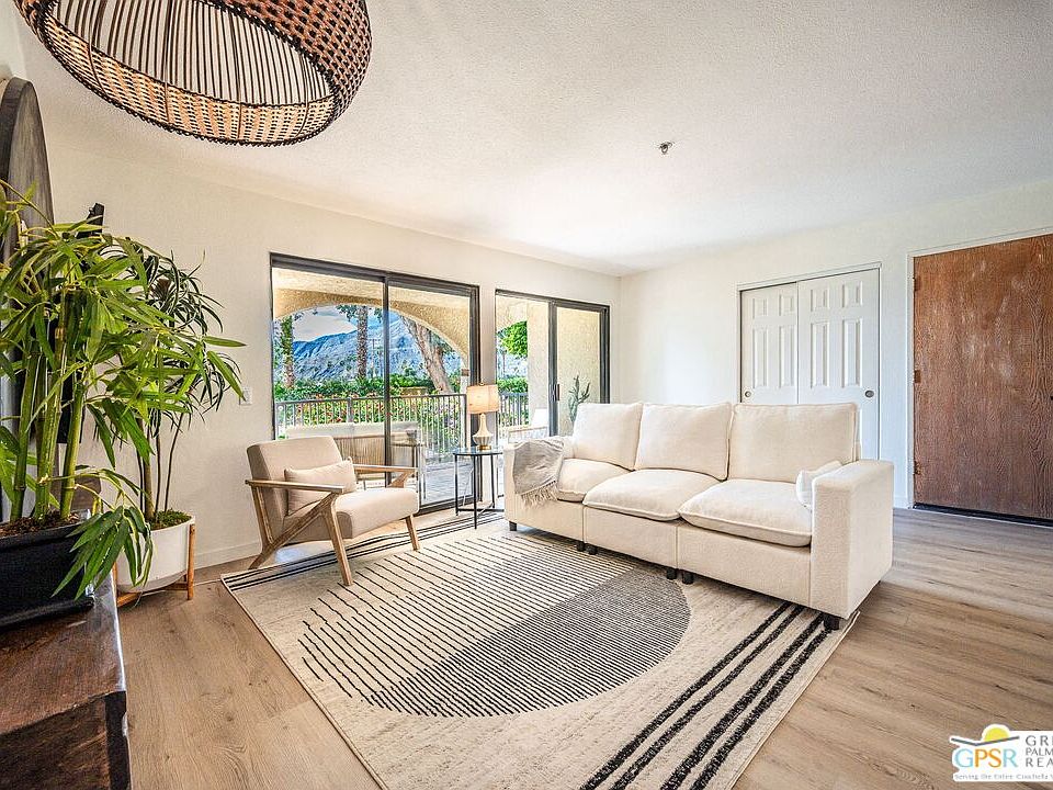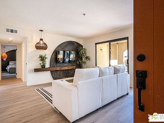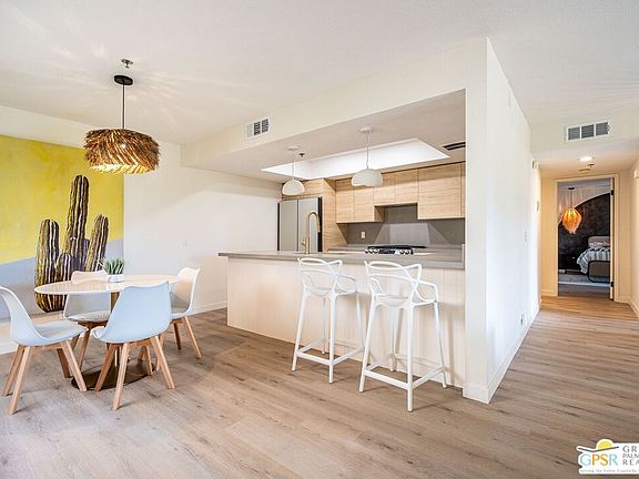Welcome to Palm Springs Paradise in this Gorgeous newly remodeled 2 bed 2 bath condo on FEE land (You own the land) with Southern Mountain Views located in the heart of Palm Springs. This condo offers a perfect example of modern living that is chic, stunning and inviting. Fully renovated in 2023 with designer touches throughout. Enter the beautiful spacious living room with luxury vinyl plank flooring through out, designer finishes on the walls with sliding glass door to your covered patio. The kitchen offers brand new appliances, quartz counter tops, breakfast bar for 4 and separate dining area. The master suite is bright with natural light, has Southern Mountain Views with en suite newly added bath, double sink, lighted mirror, modern fixtures and big beautiful shower. Guest bedroom is spacious & stylish with designer finishes on the walls with textures and paint. Closets are tastefully painted inside. Relax on your covered patio with the Southern Mountain Views perfect for wine at sunset or coffee at sunrise. Stackable washer/dryer in closet in hallway. The condo has a 1 car garage with storage, 2 community pools, 2 tennis courts and plenty of guest parking. Recreation room that can be used for parties or events. Yes you can have a pet! Your minutes from restaurants, shopping, parks, night life, hiking, The Palm Springs Art Museum, and many more attractions in Palm Springs. This condo is priced to sell.