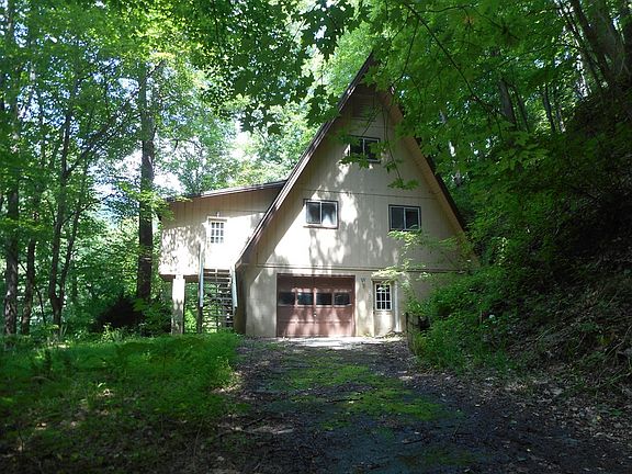 Handyman special. Chalet sitting on a nice creek tucked in the woods. Lots of potential and space with this 3 bedroom 3 bath home. Large unfinished basement with garage and bathroom. High vaulted wood ceiling with wood beams. Brick fireplace, open floor plan.Home is dated and needs flooring thru out and kitchen needs work. The home does have a new roof and new outside stairs. Home is being sold as is .