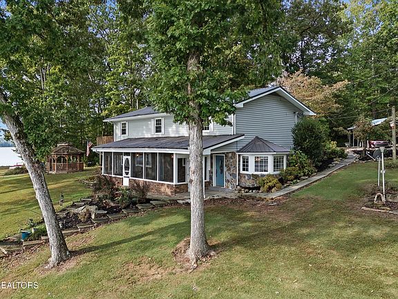 Welcome to your private LAKEFRONT retreat on beautiful WATTS BAR LAKE! This exceptional property offers the perfect blend of space, privacy, and unbeatable lake access, featuring a main home with 2,440 sq ft | 3 Bedrooms | 3 Bathrooms, a GUEST HOUSE with 830 sq ft | 3 Bedrooms | 1 Bathroom, and 311 feet of private shoreline PLUS access to a TVA-owned peninsula with additional shoreline LEVEL TO THE WATER, and a large floating EZ dock! The main house has an open-concept layout overlooking the lake with a kitchen designed for entertaining! Rich wood cabinetry, a large island, double oven, and stainless steel appliances throughout allow for those big family gatherings. The living and kitchen area flows seamlessly to a spacious screened-in porch, perfect for indoor/outdoor living. Off of the spacious living area is a bonus room that could be used as a bedroom or formal dining space. Upstairs, two generous bedrooms share a full bath, while the primary suite boasts a walk-in shower, walk-in closet, and private deck with incredible water views. Newer roof and HVAC provide peace of mind, and both the main and guest house include backup propane heat.