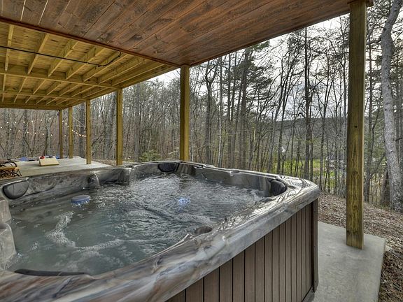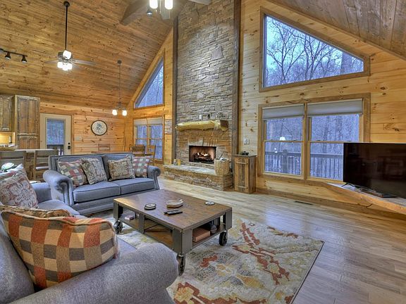 This perfect cabin in the mountains of Blue Ridge, Georgia offers a blend of rustic charm and modern elegance, perfect for full-time living or as a short-term rental investment. With 4 bedrooms, including 2 primary en suites and 4 full bathrooms, it is set on 3.44 acres of nature, offering seasonal mountain views. The spacious living room boasts a large stack stone fireplace and plenty of natural light from its many windows. The full kitchen features granite countertops and a gas stove. The lower level includes a bar area, a rec room, and an additional living space. Outdoor amenities are perfect for relaxation or entertaining, including an outdoor fireplace on the main-level deck, a lower deck for cornhole and a hot tub, and a cozy fire pit area adorned with string lights. The end of the road privacy, all on paved roads cannot be beat!! Conveniently located near downtown Blue Ridge, McCaysville, and just 25 minutes from Harrah's Casino in Murphy, NC, this property offers both a beautiful retreat and an attractive investment opportunity.