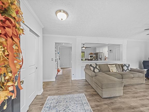 Step inside to a bright and fresh remodel. New doors, trim, light fixtures, crown molding and LVP throughout the home. Updated kitchen displays white shaker cabinets, quartz countertops, tile back splash, stainless steel appliances and a cute custom wood plank wall. Large windows bring in tons of natural light. The adjoining eat in space showcases a cozy fireplace and built ins and allows room for a large table, perfect for the family outings. Swing around the portrait wall open to a large living rooms, leading to an additional flex space. The hall bath has been beautifully renovated with new tile, tub, vanity, and fixtures, while the primary suite offers a private en suite with a walk-in tile shower. Partially finished basement is versatile for a family room, home office, or kids play area. Entertain out back with a large fenced in yard, beautiful patio with Sunsetter and tons of space host or unwind. This neighborhood feels like is own retreat with large lots, mature trees and walkable to popular Sunbury Square! This house is completely renovated, perfectly located and ready to move right in. See a2a for a list of updates!