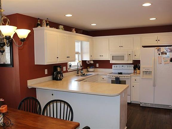 - Kitchen: Bar, Pantry, Counter Tops-Solid Surfac, Floors-Hardwood, Cabinets-Painted, Recessed Lights