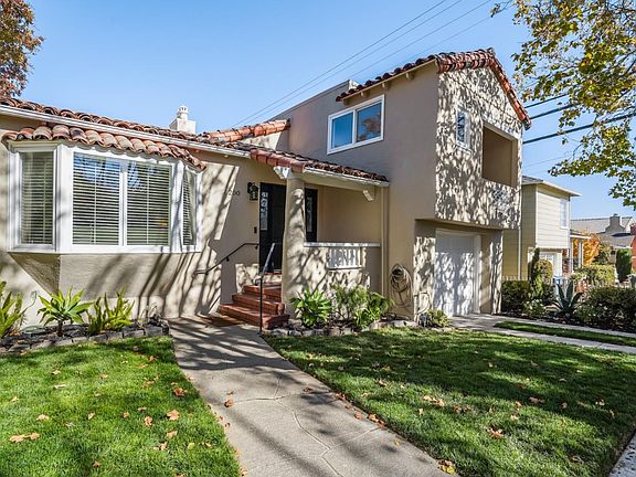 Charming updated Spanish style 4 bedroom 3 bath home in Millbrae's Highlands on a lovely tree lined street. Great room includes corner fireplace, front bay window, plantation shutters, spacious dining area and updated kitchen with island featuring retractable breakfast bar as well as bay window facing the backyard. Spacious primary suite with private balcony includes bright bathroom w/curbless shower, double vanity and ADA compliant features. Upstairs has two bedrooms (one with covered deck) that share hall bath with tub and stall shower. Lower level includes family room currently shown as guest suite with stall shower and separate entrance. Lush backyard includes large deck, mature fruit trees and raised vegetable boxes. Two separate garages (one attached and one detached). Partial basement provides area for wine storage. Laundry with sink in garage. Hardwood floors & spacious rooms throughout. Newly painted exterior as well as most of interior. Convenient to BART & Caltrain