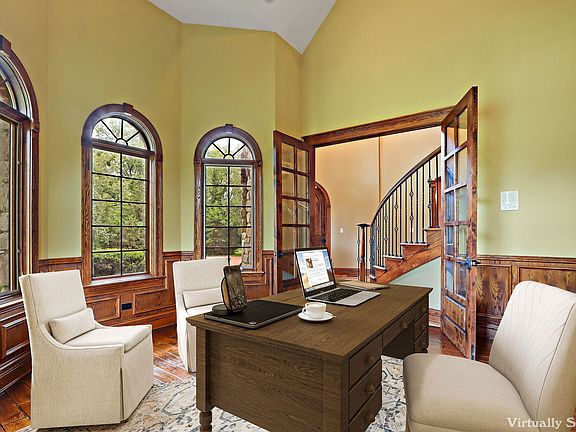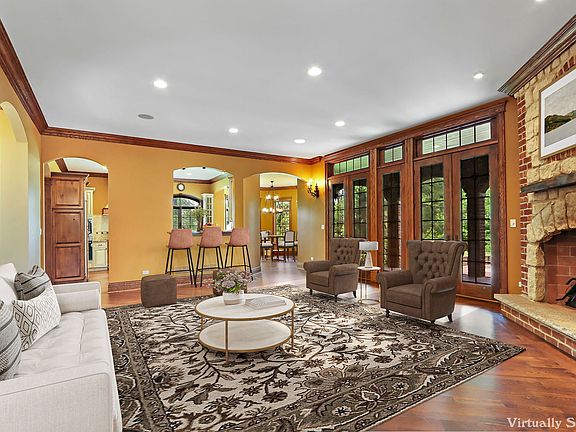 Discover your own private castle nestled on a sprawling Barrington Hills property, surrounded by mature trees and unmatched privacy-right across from Helm Woods Forest Preserve. From the moment you arrive through the gated brick paver driveway, you'll know you've reached something truly special. Enter the stone foyer, where a mosaic tile of angels greets you at your feet. Cathedral ceilings, rich wood accents, crown molding, and expansive windows set the stage for Old World charm blended with timeless elegance. Every level of the home features a warm, inviting fireplace that enhances its welcoming atmosphere. The living room flows seamlessly into the gourmet kitchen, featuring abundant cabinetry, a walk-in pantry, island with copper sink, and a breakfast room surrounded by windows. A custom breakfast table, along with a formal dining table, hutch, and chairs designed to complement the home, are available for the new owners. French doors lead to a covered terrace and circular brick patio with its own fireplace-an outdoor oasis for year-round enjoyment. Work or relax in the main floor den, filled with natural light and gleaming hardwood floors. Upstairs, the luxurious primary suite includes a fireplace, spacious walk-in closet, and spa-inspired bath with double vanity, soaking tub, oversized shower, and private water closet. Enter your private balcony-complete with new flooring-for serene views and quiet moments. The second floor also includes an additional ensuite bedroom, two bedrooms with Jack-and-Jill bath, a conveniently located laundry area, and a massive bonus room perfect for a playroom, home gym, studio, or office. The finished lower level offers even more living space with brand-new carpeting, a bedroom with ensuite full bath, wet bar, wine room, and cozy fireplace lounge. A large projection screen with sound system is included-ideal for unforgettable movie nights. Additional highlights include: 3-car garage with mudroom, fittings for a second washer/dryer, and a custom dog wash and fenced dog run. Maintenance-free DaVinci roof (2022) with transferable 10-year warranty. Located in the highly acclaimed District 220 schools, this one-of-a-kind property also offers easy access to horseback riding trails, nature preserves, Metra train, expressways, restaurants, shopping, and community events. If you've been searching for a truly unique home filled with elegance, privacy, and modern comforts-your Barrington Hills castle awaits!