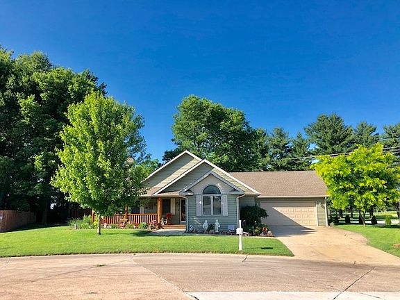 Gorgeous log wrap around porch greets you at this 1803 SF ranch on crawl space in cul de sac just off Armory Rd, cathedral ceilings, 3 BR's plus den-that could be 4th BR, all solid wood doors, trim, new stainless appliances, newer: Room (Elk shingles), siding gutters, shed entry door, shutters, flooring, carpet & vinyl in kitchen, hardware, gorgeous new fireplace facing and mantle, great natural lighting, privacy fenced yard-yard is much larger than fenced area (.263A)-part of woods included, partially floored attic with pull down stairs-there's a light to the right. Can walk to all schools! 25x22 garage, new 10x12 storage barn and 12x10 deck and walkway. If you're looking for a move in ready home-this is it!