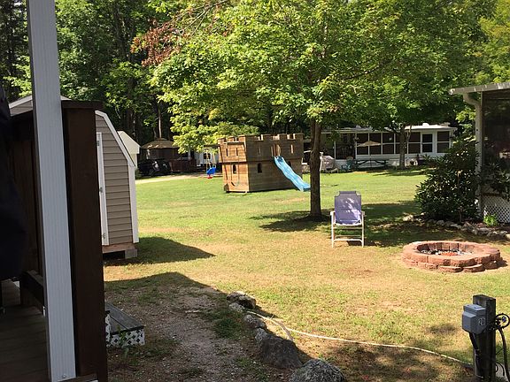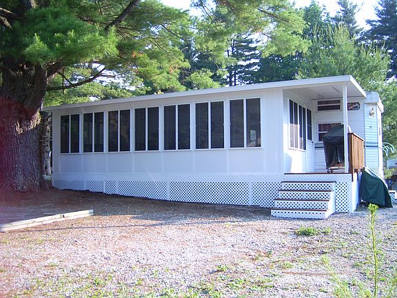 Original owners-mint condition 2002 40' two bedroom Layton Park Model on-site seasonal stationary trailer with attached 12' x 28' three season room. Second bedroom has 4 bunk beds. 8' x 8' shed with electric, located on a corner lot with stone driveway. 40 gal. Propane hot water tank, flush toilet, 3/4 bath with shower stall and linen closet, new upgraded faucets in kitchen and bath, new kitchen floor. Town sewerage and on-site well water. Cable service available. Trailer is available fully furnished including full size futon, microwave, full size stove/oven and refrigerator, TVs, and central air. Fully furnished three season room with carpeting including brand new power reclining sofa, glass top table with 8 chairs, glass top bar with 2 bar chairs, med size refrigerator/freezer, portable A/C, two small electric fireplaces, 40" Sony flat panel LED TV, Blu-ray DVD player and sound bar also additional track lighting and electrical outlets. Gas grill included and much more, turnkey ready. Private beach with entry into Paugus Bay. Boat and Jet Ski docks available through park management. Seasonal rent of $2800. Park lease runs from May 1st to Nov 1st. renewed yearly.