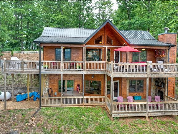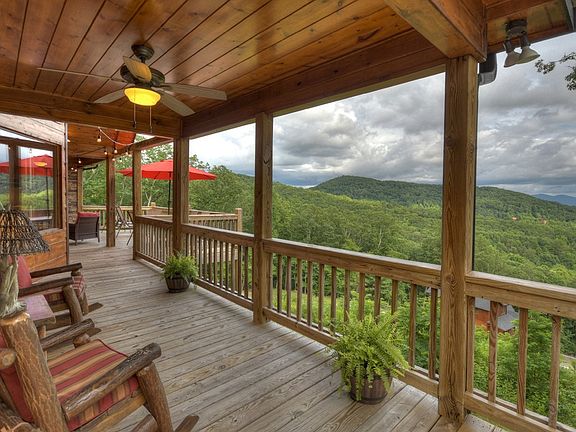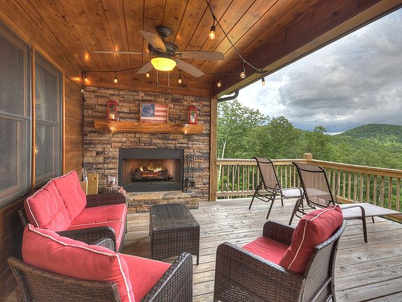 3BR, 3BA pristine home features open spacious floor plan w/double master suites. PANORAMIC MTN VIEWS on both levels. Cathedral ceilings, hardwood floors throughout, custom cabinetry, rock gas log fireplace in GR, granite countertops, walk in tile showers, white pine tongue & groove interior. Large covered porch spans the length of the home w/add open party deck connecting to wrap around deck. Rustic architectural details including cedar shake accent covered porch entry w/hand hewn siding & metal roof. Basement w/ BR, BA & huge REC/Media Rm opening onto terrace patio. Beautifully furnished. 2 outdoor wood burning fireplaces.