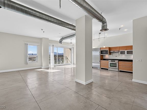 Fantastic strip and mountain views! Loft living with all the upgrades. Grand great room with living, dining, kitchen and bedroom area. Separate den that could be also used as a bedroom space, office or what special area you would like. High ceilings with large windows for lots of light. High end stainless steel appliances with built in fridge & microwave. Island on wheels so can use as island or move around to use as you choose. High end European style cabinets. Sit on your balcony and enjoy the city lights and mountain views. Fresh 2 tone paint. Primary bath with soaking tub, shower and walk in closet with built in safe. Second bath with shower. Rooftop pool and spa, fitness room, garage space and also has private storage room in garage. Luxury loft living downtown right in the Arts District. So many restaurants, bars and lounges, shopping plus all the casino action a short walk away. Great location in the heart of downtown. Great I15 access. Near the Las Vegas Medical District.