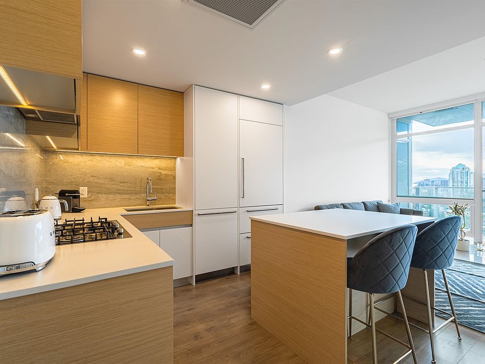Breathtaking Views in West Vancouver. Enjoy panoramic views of the North Shore Mountains, ocean, and Lions Gate Bridge from this stunning 1-bedroom, 1-bathroom west-facing home in The Sentinel. Designed for luxury living, this immaculate unit features a spacious balcony, soaring 9-ft ceilings, floor-to-ceiling windows, and A/C for year-round comfort. The gourmet kitchen is perfect for entertaining, with a sleek island, high-end AEG appliances, a gas range, and quartz countertops and backsplash. Residents enjoy resort-style amenities, including a concierge, party lounge, fitness center, sauna, steam room, hot tub, yoga studio, outdoor lounge, and three guest suites. Owner-occupied and in excellent condition!