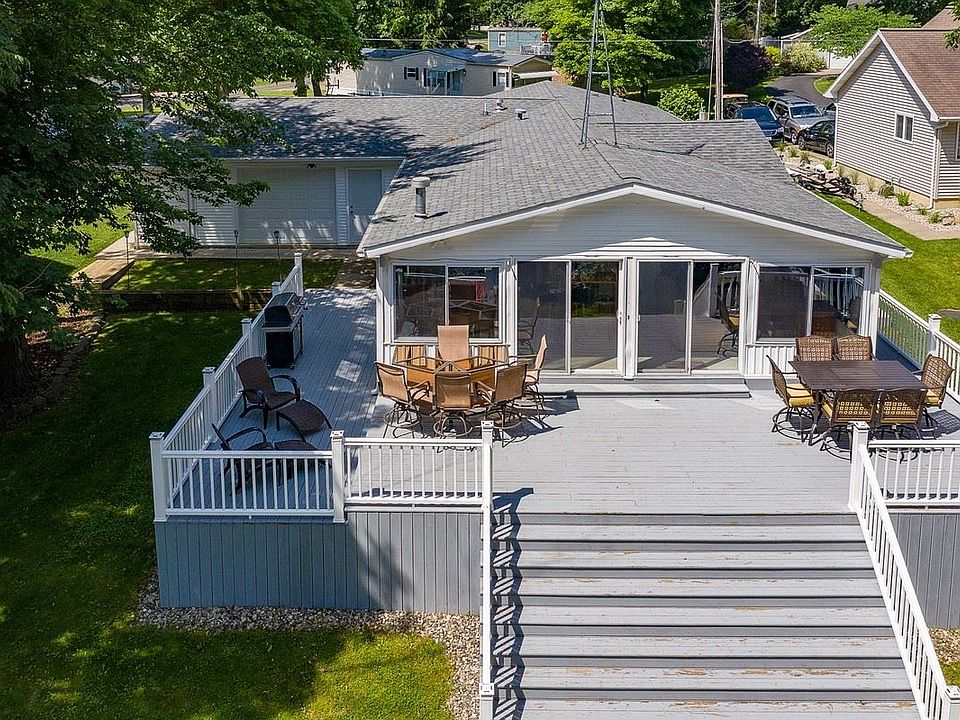 A great opportunity on Lake James! This 3 bedroom/2 bath home overlooks the lakefront association beach, pavilion and docks for Lake James Estates. Just like being lakefront with awesome views of 3rd basin and direct access without the expense of being lakefront. A spacious home all on one level and includes a 2 car attached garage, a wraparound lakefront deck, fire pit and shared stairs to the lakefront association access. The kitchen has an island and the appliances are included. The dining area and living room are open to the lakeside sun room. All rooms are good sized and the laundry room includes the washer, dryer and a utility sink. The garage has a overhead door on the roadside plus an overhead door on the lakeside for easy storage of patio furniture and water toys. It can also be turned into a party room with lake views. A perfect set up for year round or seasonal use. The drive to the dock is a short distance and all paved.