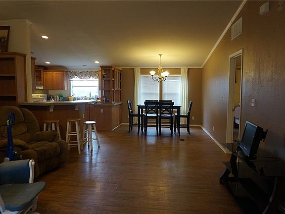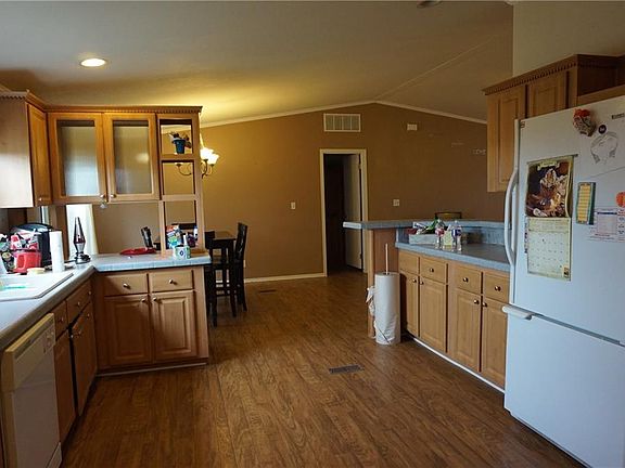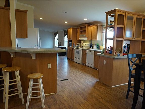 3-2 Palm Harbor DW mobile home situated on 5.166 wooded acres, m-l; Two living areas, one with built-in book shelves; Open concept living room dining area, kitchen and 2nd living area; Split bedrooms; CH-A and hot water heater; Kitchen has a breakfast bar, dishwasher, free-standing stove and built-in hutch; The master bedroom has an adjoining ensuite with dual vanities, a corner, jetted garden tub, step-in shower and large walk-in closet; The hall bathroom has a tub-shower combination, linen cabinet, vanity and serves two bedrooms; Full size utility room adjoins a storage room or small office; Wooden deck with a fenced dog run; Co-Op water, septic system, older single wide MH (poor condition) used for storage