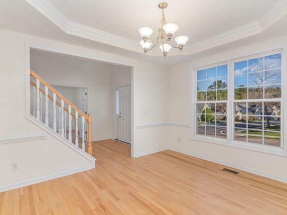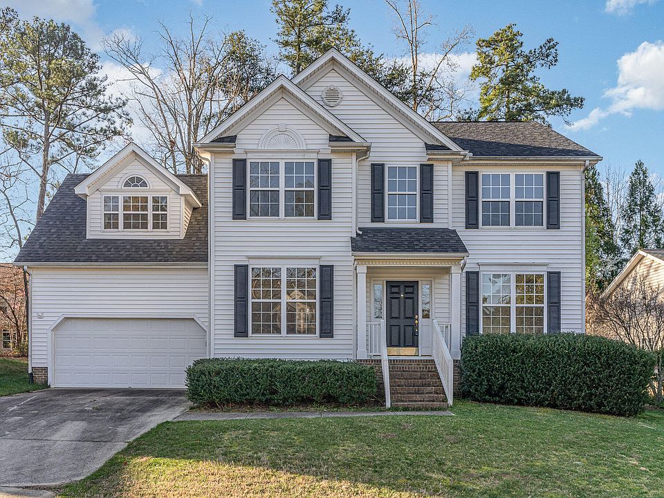 Welcome to this immaculate two-story home in Parkside subdivision, offering 4 bedrooms and 2.5 baths on a meticulously maintained large lot with abundant upgrades! Inside, discover hardwood floors and an abundance of windows that flood the space with natural light. The family room features elegant tray ceilings and a cozy fireplace, while the updated kitchen boasts new cabinets, countertops, tile backsplash, stainless steel appliances, and ample space for cooking and entertaining! Connected to the kitchen is the dining room, providing seamless flow for hosting guests. The primary bedroom offers vaulted ceilings, a walk-in closet, and a completely renovated ensuite bathroom with a soaking tub, walk-in shower, and dual vanities. Step onto the back deck to enjoy views of the spacious lot and tree line buffer. Conveniently located off Hwy 86 and I-40, quick access to downtown Chapel Hill's array of restaurants, shops, and events awaits. Don't miss the chance to call this luxurious home yours. Schedule your showing today!