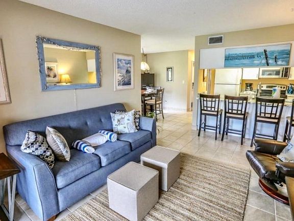ANNUAL RENTAL: Newly remodeled condo available to rent annually unfurnished. Furnished photos are for illustration only. This super cute condo is on the south end of the island of Ft Myers Beach and has a beautiful view of the largest canal on the island. It's an end unit so you have more space with a separate dining area and more light. Santini Plaza and the beautiful beach is a brief walk down the road and more shops and restaurants are opening every week. Owner will pay for water and wifi and the tenant will only pay for electric. AC is new so it's really efficient. This condo is on the first floor but sits high so it did not get any water in it from Helene or Milton. If you're looking to live the beach lifestyle, this condo could be perfect for you! 12 month lease. Available now. Owner pays for water and wifi, tenant pays for electric.