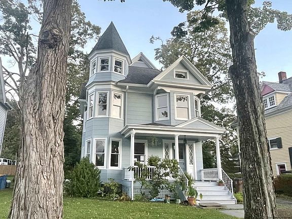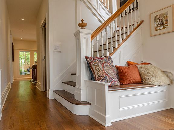 Little to do but add your furnishings at this c.1900 home, just renovated top to bottom; restoring the charming details and history and building all completely new systems; electrical, plumbing, kitchen and bathrooms. From the installation of new water and sewer lines to the street’s mains. nothing was left to chance. Interior plumbing and wiring was gutted out and completely replaced with new components, including all Pex lines and PVC waste lines. Electrical meant new 200 amp service panel, all new wiring with upgrade Lutron receptacles and dimmers throughout. All walls and roof were insulated by a professional insulation specialist, to current standards. A full sprinkler fire suppression system was installed to allow for full, permitted use of the third floor brand new bonus room; floored in oak with shiplap surfaces. The freshly installed concrete walkway and blacktop driveway support the water-proofing of the stone walled basement, as does the new, whole house, permanent, self draining de-humidifier. The modernist kitchen combines all new, top stainless Bosch appliances (including an induction range) with designer, grey and natural oak cabinetry topped by terrazzo look, quartz stone countertops. The cabinets were finished to coordinate with the new oak flooring. Lighting fixtures were chosen to highlight the high ceilings and provide warm ambient lighting. All oak floors throughout the house were stained with a warm "Provincial" matte finish to enhance the crisply refreshed original wall surfaces, Victorian trim, staircase, and baseboards, all multi-coated in a soothing white paint. The primary bedroom features a stunning en-suite new bathroom, with double vanity, heated floors, and Grohe fixtures, as throughout the house. The hallway full bath upstairs has a new cast iron tub, modern take subway tile surround, and a custom designed and created modernist vanity and sink, of quartz and oak. It too has a heated floor.