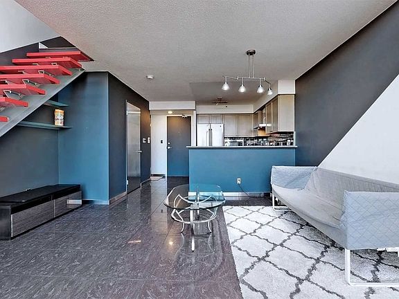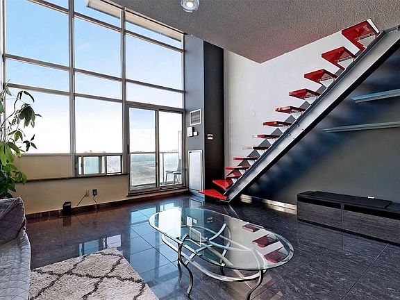 Rare South-Facing 2-Storey Loft W/ 2 Bathrooms, Balcony, Locker & Deep Tandem Parking That Fits 2+ Cars! Ultra Sleek W/ Floating Staircase, Italian Porcelain Flooring, Approx 17' Floor To Ceiling Windows & Unique Toggle Light Switches With Aircraft Parts! Indulge In Immense Natural Lighting That Beautifully Reflects Off The Stainless Baseboards & Doors. Main Bedroom On The 2nd Floor Has Ensuite 4Pc Bath, Laundry & Option To Watch Movies On Projection Screen.