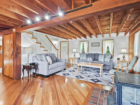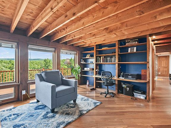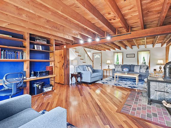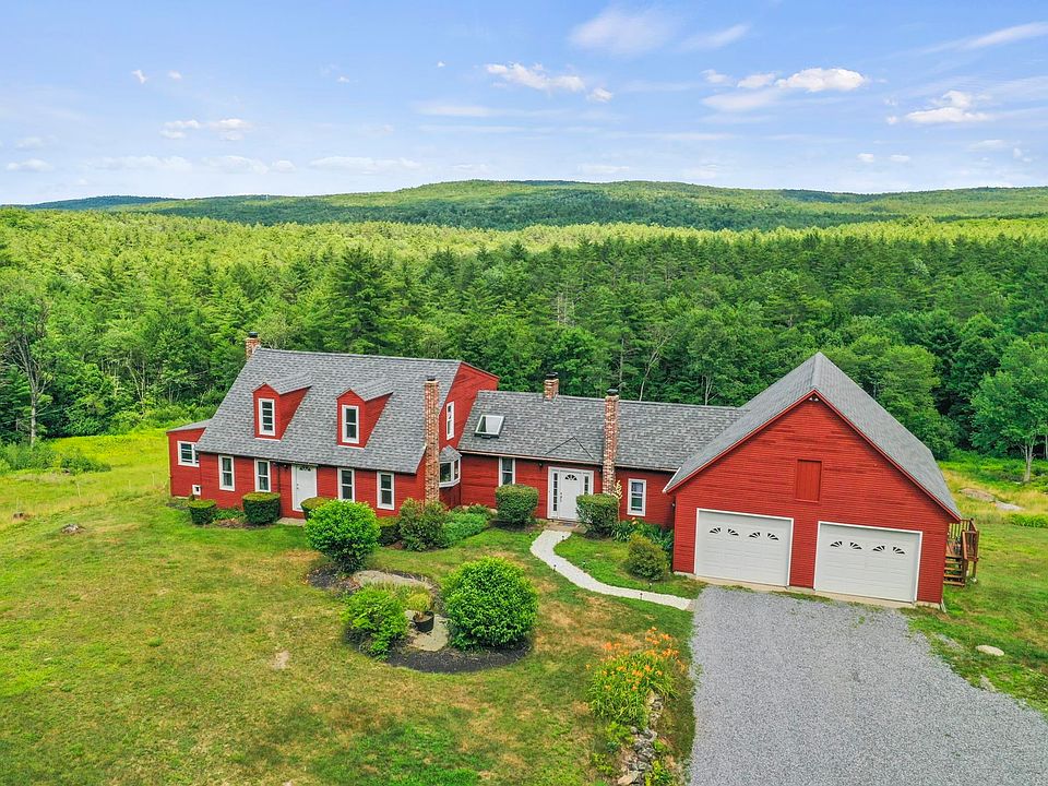 Nestled on a 30 acre lot in the stunning Franconia Mountain Range, this charming 4bed, 2bath home combines rustic elegance with modern comfort. The inviting living room has large windows gleaming with natural light, a wood parlor stove, and an exposed beam ceiling that seamlessly flows into the dining room, where you will find a second wood stove, this one a cooking stove. The kitchen boasts ample counter space and stainless steel appliances, perfect for culinary enthusiasts. The family room features yet another wood parlor stove, a cozy sitting area, and soaring cathedral ceilings. The primary bedroom on the second level offers vaulted ceilings and generous closet space, providing a tranquil retreat. Three additional bedrooms and two full baths ensure plenty of room. Through the French doors in the dining room enjoy breathtaking views from the deck, perfect for relaxation and outdoor entertaining. The property also includes a two-car garage and multiple sheds, offering ample storage space. Recent improvements include a newly installed solar powered Velux skylight, new paint inside and out, and the deck was freshly stained last year. Propane tanks under deck for automatic generator and gas stove in kitchen. 100A Subpanel in garage. Experience the perfect blend of nature and comfort in this beautiful Franconia Mountain home.