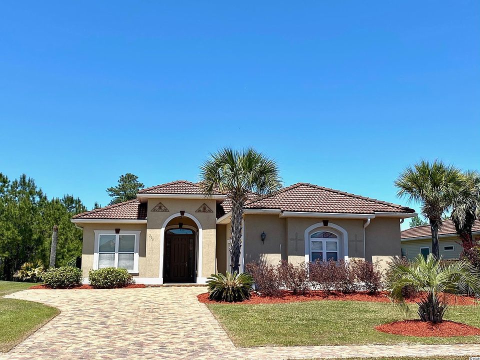 Beautiful Mediterranean home with 3 bedroom/2 baths. Great view of pond. Home has open floor plan with ceiling fans in all rooms. Master bath has double sink, walk-in closet, spa tub. kitchen has granite counters and stainless steel appliances. Brick paver driveway, large screened in porch and irrigation system for the yard. Home is located close to restaurants, shops and beach. All measurements are approximate and not guaranteed. Buyer is responsible for verification.