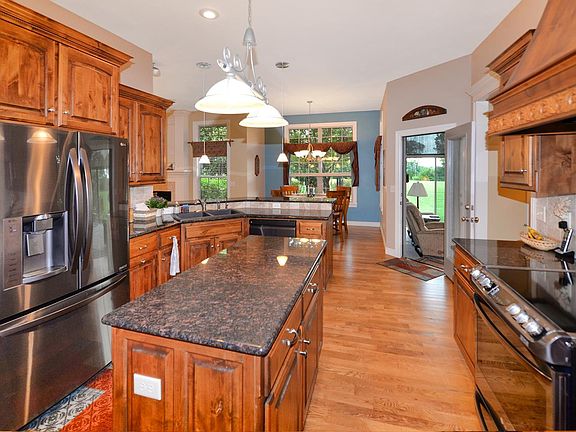 Gorgeous one level brick home on 5 acres! No steps required! Features include 4 bedrooms, 3 baths, open floor plan, hardwood floors, formal living room with fireplace, family room, beautiful eat-in kitchen with island, granite counters & alder wood cabinets, formal dining, huge all seasons room, spacious master bedroom with a sitting area & 2 walk in closets, master bath with dual vanities, walk-in shower & jetted tub, laundry room with sink, heated 3 car attached garage with 7 x 7 shop area, huge 37 x 37 shop with 2 horse stalls & tack room. Take a look and fall in love!