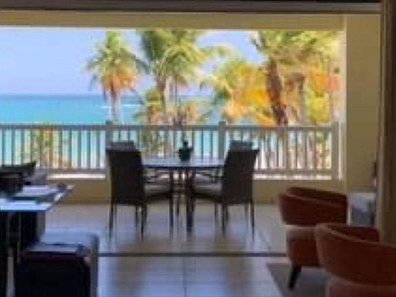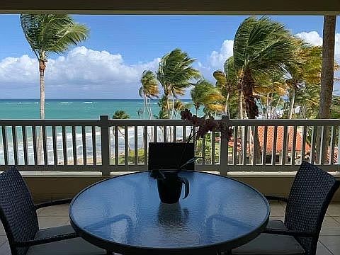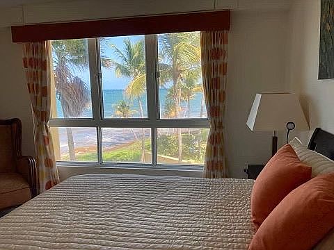 Beautiful Luxury Ocean Front 2 bd, 2 1/2bath unit in The Marbella Club in Palmas del Mar. Ocean views from Kitchen, Living Room and Master BedRoom. Designer done with drop ceiling, triple molding, recessed lighting, and hand made alabaster light fixtures throughout unit. Veranda 24’x10’ protected on 5 sides from sun, rain and wind ( great for entertaining) which opens up completely allowing you to enjoy an "indoor / outdoor living" space, perfect for entertaining. Flexible space to divide into two apartments (can be rented separately), one of the rooms has a separate access door. Short-term rentals are allowed. The complex offers 3 swimming pools, a gazebo area, green areas, a power generator for the entire apartment and direct access to the beach. 24/7 security, electronic system for access to the complex, gym, storage space and wine cellar area. Designated area for golf carts. Living room, kitchen, master BR and veranda overlooking Vieques and Caribbean 20 yrd away. Not subject to appraisal
