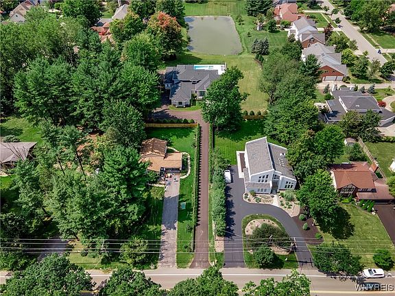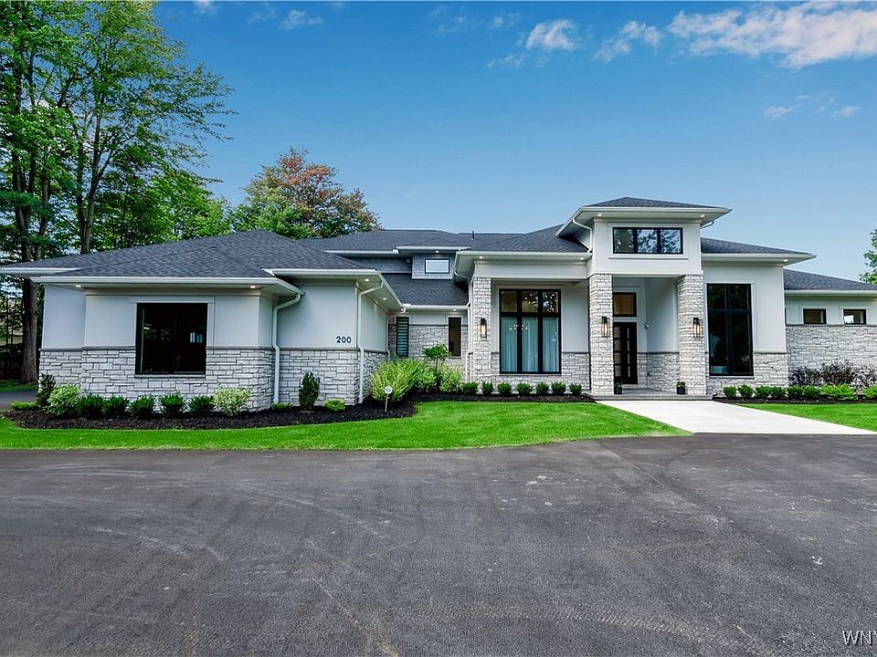Located within the sought-after Williamsville School District, this extraordinary modern estate offers approximately 9,200 sq ft of finished living space and a rare 6 bedroom, 6 full bath, 2 half bath layout, masterfully designed across three expansive levels and completed in 2023. The main floor is anchored by a breathtaking two-story great room with soaring 20' ceilings and a dramatic floor-to-ceiling stone fireplace, which opens seamlessly to the outdoor living space. Motorized Anderson MultiGlide doors in both the kitchen and living room fully retract into the walls, removing the boundary between indoors and outside and creating unobstructed views of the outdoor living area and pool. Every room features tray ceilings, while 9/16" champagne white oak flooring flows throughout the home, excluding only the theater room and upstairs bedrooms, while the reverse brick ledge construction allows for completely flush transitions on the first floor. The chef’s kitchen showcases quartz countertops and backsplashes, a Wolf six-burner cooktop, stunning custom cabinetry, a walk-in pantry, and top-tier finishes. Each of the 6 bedrooms features its own private en-suite bath, including a first-floor primary suite with a massive walk-in closet, fireplace, and spa-inspired bath with dual vanities, dual showerheads, and a soaking tub within the shower. A second first-floor bedroom, private office, and a theater room complete the main level, while three additional bedroom suites upstairs include 2 rear-facing rooms with serene views. The outdoor living area feels like a resort with an in-ground pool and integrated hot tub, stamped concrete patio, and a covered outdoor living area with retractable screens, fireplace, grill, and built-in speakers. The fully finished lower level is designed for elevated entertaining and recreation, featuring a lowered area ideal for a golf simulator and a walk-in safe. Additional highlights include an oversized five-car garage, multiple gas fireplaces, built-in speakers throughout, dedicated laundry rooms on both levels, exceptional mechanics and construction, making this one of the most distinctive residences ever offered in Western New York.