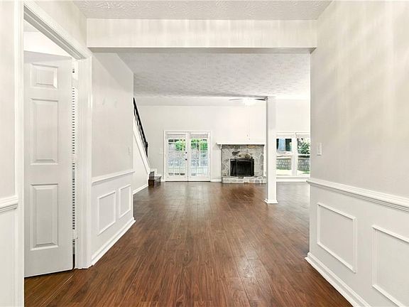 Beautifully refreshed and awaiting new owners! This gorgeous 2 story home features the primary bedroom on the main, a huge open family room with cozy fireplace & kitchen open to family room. The half bath on main is situated near the front door providing ease of access for you and your guests and the laudry room is tucke away near the garage area.Travel upstairs to two secondary bedrooms which share the hall bath.The upstairs gives you amazing views of the family room below and if that isn't enough to entice you, check out the covered back patio which is designed for outdoor living overlooking the backyard.This home features a 2 car garage & additional parking in the driveway but the best part is NO HOA.Minutes from Avalon,North Point Mall and GA-400.Come see what this charming location has to offer you and your family.This home has been virtually staged to enhance its potential.