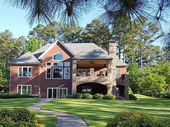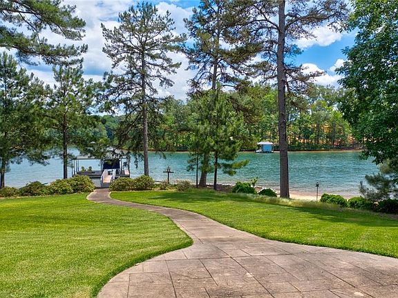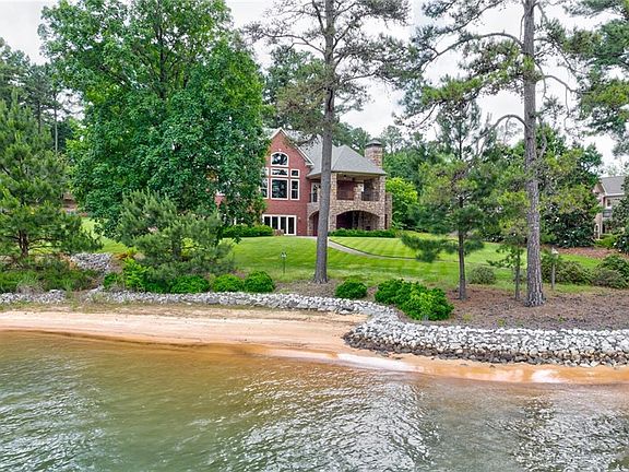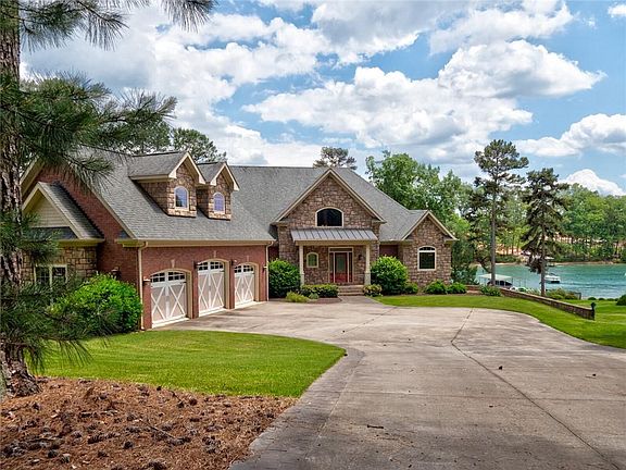 This custom built, and single owner, home is being proudly offered for the first time. The 1.0 acre lot is perfectly sloped, provides beautiful views, has 186'+/- of shoreline to house the covered dock with boat lift, private beach and protection from busy boat traffic--a combination of features that will please the most educated waterfront property buyer. The exterior of the home is high quality and low maintenance with brick and cultured stone. The entrance reveals 20' living room vaulted beam ceiling and floor to ceiling windows to capture the panoramic lake views. The floor plan is spacious/open with both the owner's suite and a coveted 2nd bedroom and 2nd full bath on the main level separated by the living, dining and kitchen. The owner's suite features his and her walk in closets, large soaking tub, walk in shower and those panoramic lake views. Indoor entertaining is effortless as the kitchen, keeping room and lakeside informal dining all flow perfectly and provide ample space. That said, it's going to be really hard to not spend most evenings on the covered porch with it's own wood burning fireplace...there's always shade and a nice breeze on this porch and you're going to love it. The walk in pantry and laundry room round out the main level. The 3 car garage is 24' deep, doors 9' wide and middle door is 9' tall allowing room for larger automobiles. The lower level provides another 3 guest bedrooms, flex room (office/hobby/craft/fitness) 2 baths including one "lake bath," and great storage/shop space that is conditioned. The recreation room is large enough for living and game space and walks out to the huge covered and uncovered lower patio. The uncovered patio to the right was built to house a recessed hot tub and there's 50 amp service installed for easy hook up. 2 of the 3 lower level guest bedrooms are on the lake side and all 3 are large enough for many different bed configurations (king, queen, twins, bunks etc). The lower right shop and storage space can be used so many different ways--the room with the window is heated and cooled so it could remain a shop or be finished into an office or other useful space for the buyer. Additional notes: Natural gas, plumbing in lower rec room west wall if buyer wants to install a wet bar, 2 electric tankless water heaters, irrigation from the lake, central vac, cut out in dock to install 2 PWC lifts so they will be covered, Storage: There are multiple storage areas in the walkout basement as well as attic space above the garage.