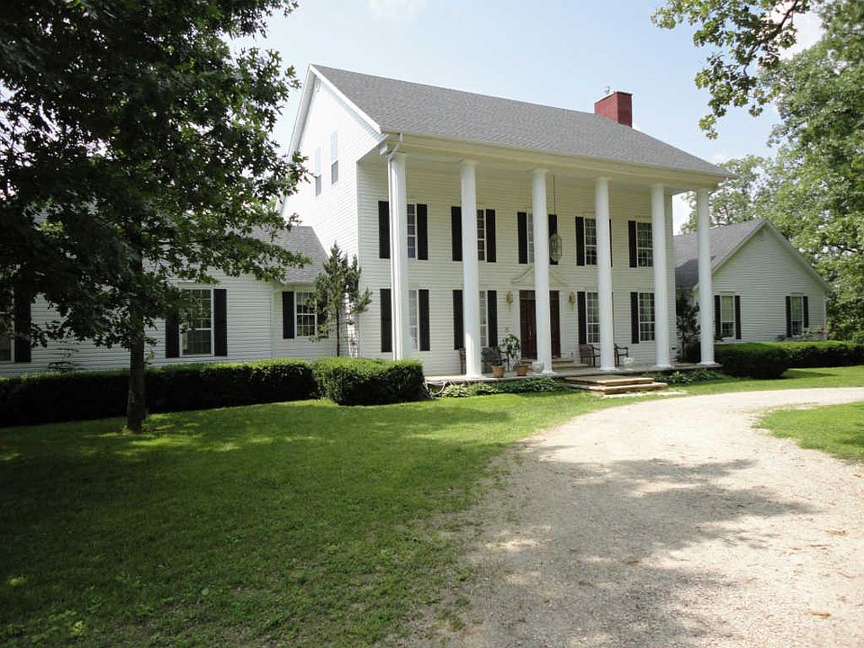 Southern Plantation Home on private 27 acres with stately columns front and back and warm cherry stained wood accented interior. Features: Formal library with wood panels,crown molding and book shelves with 2 glass panel bifold doors; formal dinning and casual dinning with bay windows; butlers pantry; 2 gas fireplaces in family room and master suite; French doors leads to pool and patio; wood floors foyer, formal dinning, kitchen, and casual dinning, and tile in bathrooms .Master suite is on the main floor with 4 bedrooms and 2 Jack and Jill baths on 2nd floor. The 3rd floor features a huge game and exercise area with tall vaulted ceiling and storage areas. Leading from this area is a large deck high above the Fox Kidney Pool. The 2-2 car garages are well over sized. Under the back Patio there is a storm cellar and lots of storage. There's also an outside bathroom and storage that was never used. Much of the 27 acres has park-like area with an abundance of wildlife. Bull Shoals Lake is with-in walking distance and provides a winter time view and great fishing. Although there's privacy with no neighbors in view, it is only 5 min. to town and 15 min to Branson.
