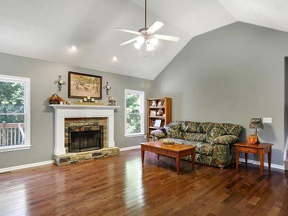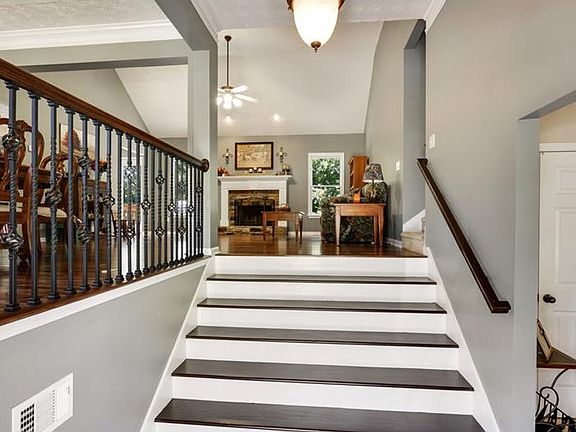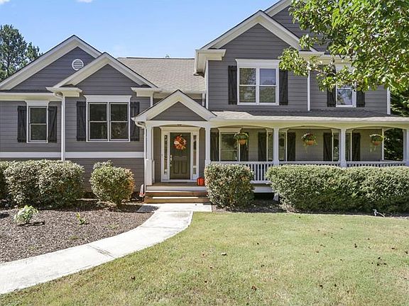 Beautiful, updated 4 BR/3BA w/rocking chair porch! Open Spacious Layout For Easy Living! Gourmet Kitchen w/sunny breakfast area overlooking private wooded backyard! NEW Granite Countertops, Designer Backsplash, SS Appliances. Hardwood floors, including Kitchen & Dining room, Upgraded lighting & ceiling fans. Freshly Painted inside & out! Great room w/stone FP & extra family room. Master BR/ BA w/trey ceilings, his & her closets, dual vanities, separate shower & jetted garden tub! Level driveway, oversized two car side entry garage. Unfinished basement.