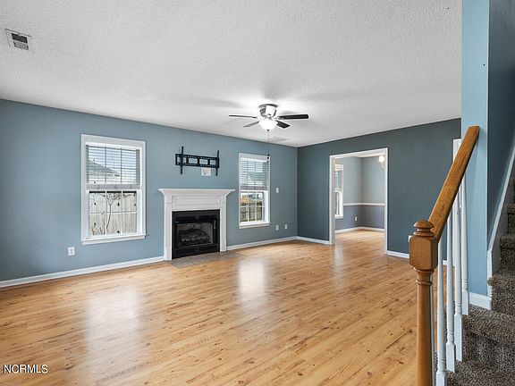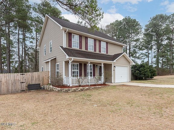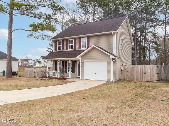 Welcome to your dream home on over half an acre of serene beauty! This delightful 3-bedroom with additional BONUS ROOM, and 2.5-bathroom home is tucked away on a secluded cul-de-sac, offering privacy and tranquility. A charming front porch welcomes you to a property adorned with mature trees, a large fenced yard, and a spacious deck, creating the perfect backdrop for outdoor enjoyment and nature. Step inside to discover a tastefully designed interior featuring well-kept laminate floors in the living area and upstairs bathrooms. The open layout on the first floor seamlessly connects the living, dining, and kitchen areas, creating an ideal space for entertaining. The fireplace adds a cozy ambiance to the living space. The kitchen, with some updated stainless steel appliances, is a culinary haven. Adjacent to the living and dining area, it ensures that the chef is always part of the conversation. A door leading to the generous deck, provides an excellent spot for outdoor dining or relaxation. Upstairs, newer carpet graces the floors, leading to a spacious master bedroom with an ensuite and his and her closets. Two additional roomy bedrooms, a full bath with a double vanity, and a versatile bonus room offer endless possibilities for customization. Convenience meets functionality with a one-car garage featuring a door that leads to the outside, making storage and access a breeze. The newer roof adds durability and peace of mind. Sellers are sweetening the deal by including the washer and dryer, along with a home warranty. Nestled in a smaller, low-traffic neighborhood with no HOA and no city taxes, this home is just minutes away from restaurants, shopping, schools, and key destinations like Camp Lejeune, downtown Jacksonville, and Western. Seize this rare opportunity to own a slice of paradise in a prime location. Schedule your showing today!