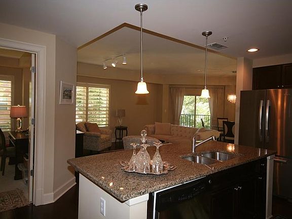WOW! Resort Executive living! Gorgeous main level end unit w/hardwds throughout. Open/light/bright kitch w/stained cabinets, stainless appliances, built in microwave, island+pantry, overlks familyrm. Breakfast area with glass doors out to large balcony overlks courtyard. Master bedrm w/deep trey ceiling. Large master bathroom w/double vanities w/granite vanity tops, deep garden tub, travertine tiled floor+shower, large walk in closet. Extra "flex" room perfect for office or study. Gated, concierge, 2 pools, fitness center, clubhouse, dog park+walk to Chattahoochee! 12/22/15