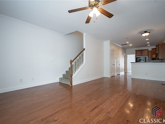 This conveniently located townhome has tons of space for the money! Located on the eastside of Athens GA only minutes from UGA and the Vet School. Walking through the front door you are greeted with a large open floor plan with 9 ft ceilings and hardwood floors. The kitchen is open to the living room and features beautiful cabinets with granite counter tops, a smooth top stove, microwave and refrigerator. The main level also features a large bedroom with doors that opens up to the spacious deck. Upstairs you will find 2 large bedrooms, each with their own bathroom. The terrace level features an unfinished space ready to be finished out to suit the new owner. There is also a garage with a garage door opener. The HOA takes care of the lawn and exterior maintenance. This home would be perfect for anyone wanting to be close to everything Athens has to offer!